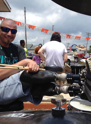 Always one to face trials head on, after his last surgery when he received his prosthetic legs, he began trying to play drums. In the beginning, he was able to play through about half of a three minute song. He continued pushing until he was able to play full one hour sets and, with a couple good friends, formed the band TenGrandLeg.